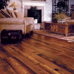 With its strength and durability, heart pine was used extensively in shipbuilding, as well as for houses, barns, factories and warehouses. The supply of this wood is limited because the old-growth yellow pine trees were all cut down by the early 1930s. This beautiful reclaimed flooring is characterized by its varied grain patterns and unique colors of light gold, shades of red, orange, brown, and dark honey. The dramatic coloration is created by an oxidation process; the planks change color as they are exposed to season after season of heat, cold, snow and rain. The planks expand and contract as they go through the seasons, becoming harder as the colors deepen. The sapwood begins to crystallize and deepen in color. Other characteristics of reclaimed heart pine include knots, nail holes, mineral stains and occasional saw marks.
